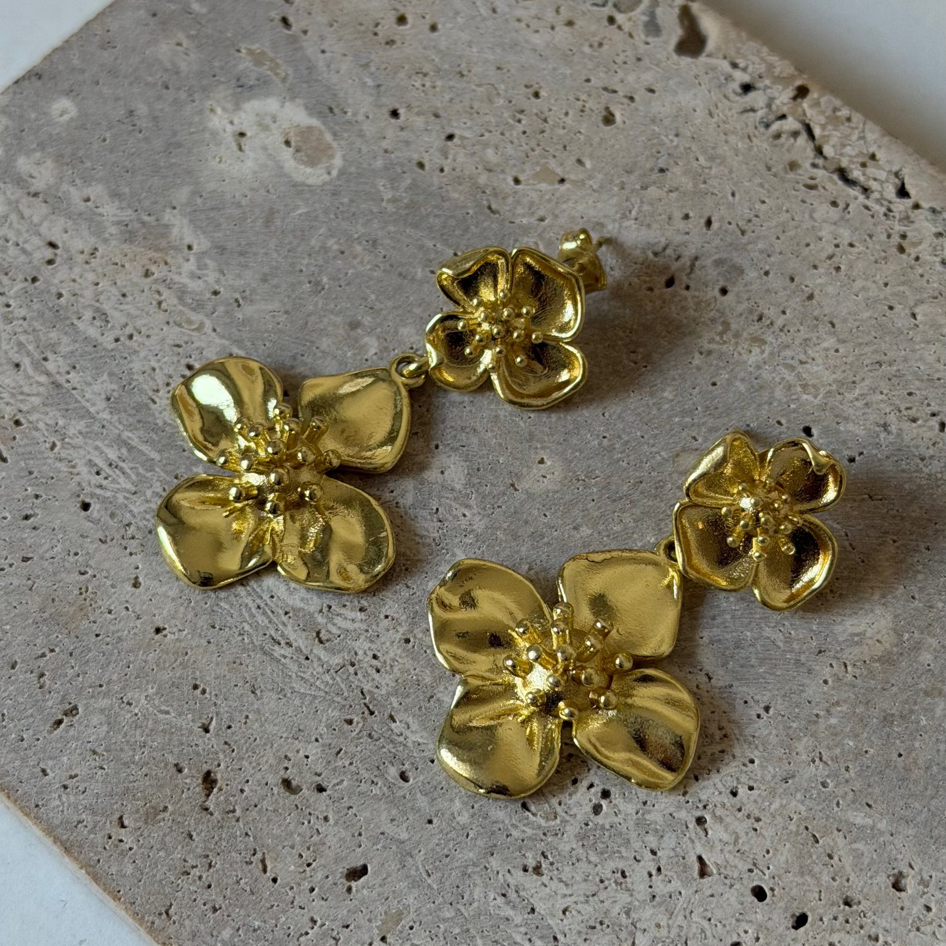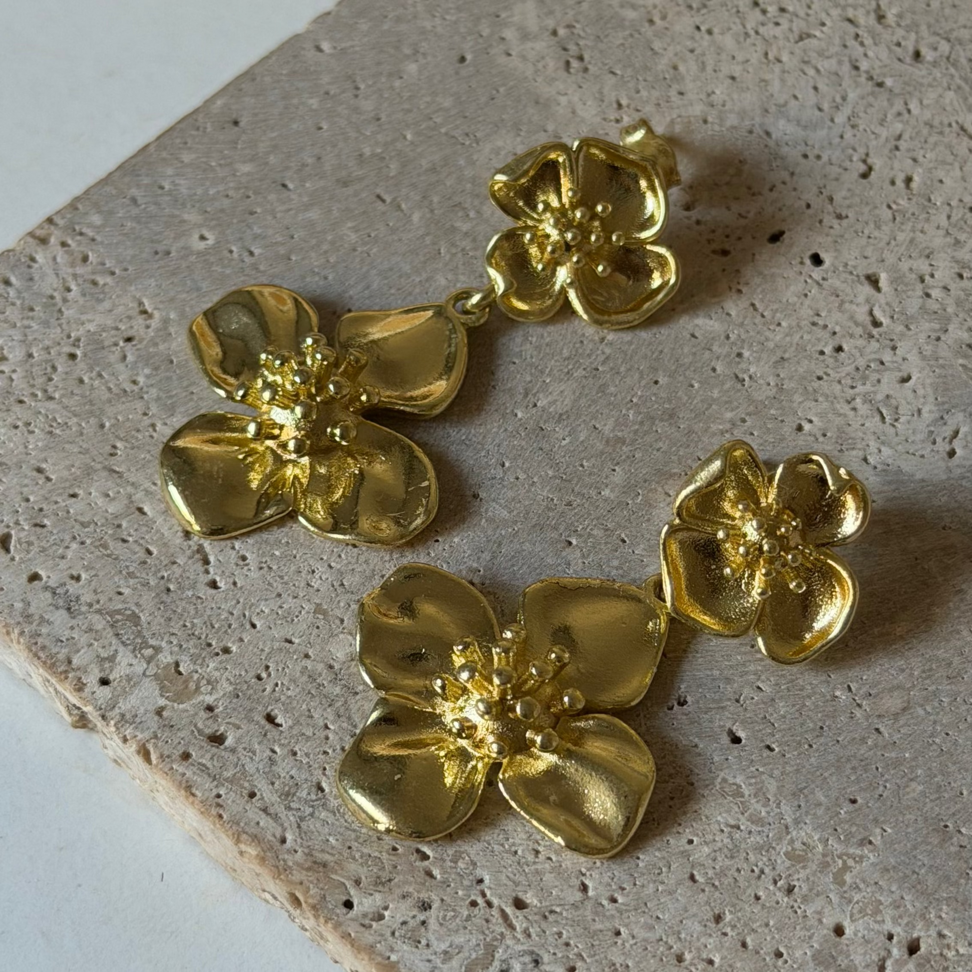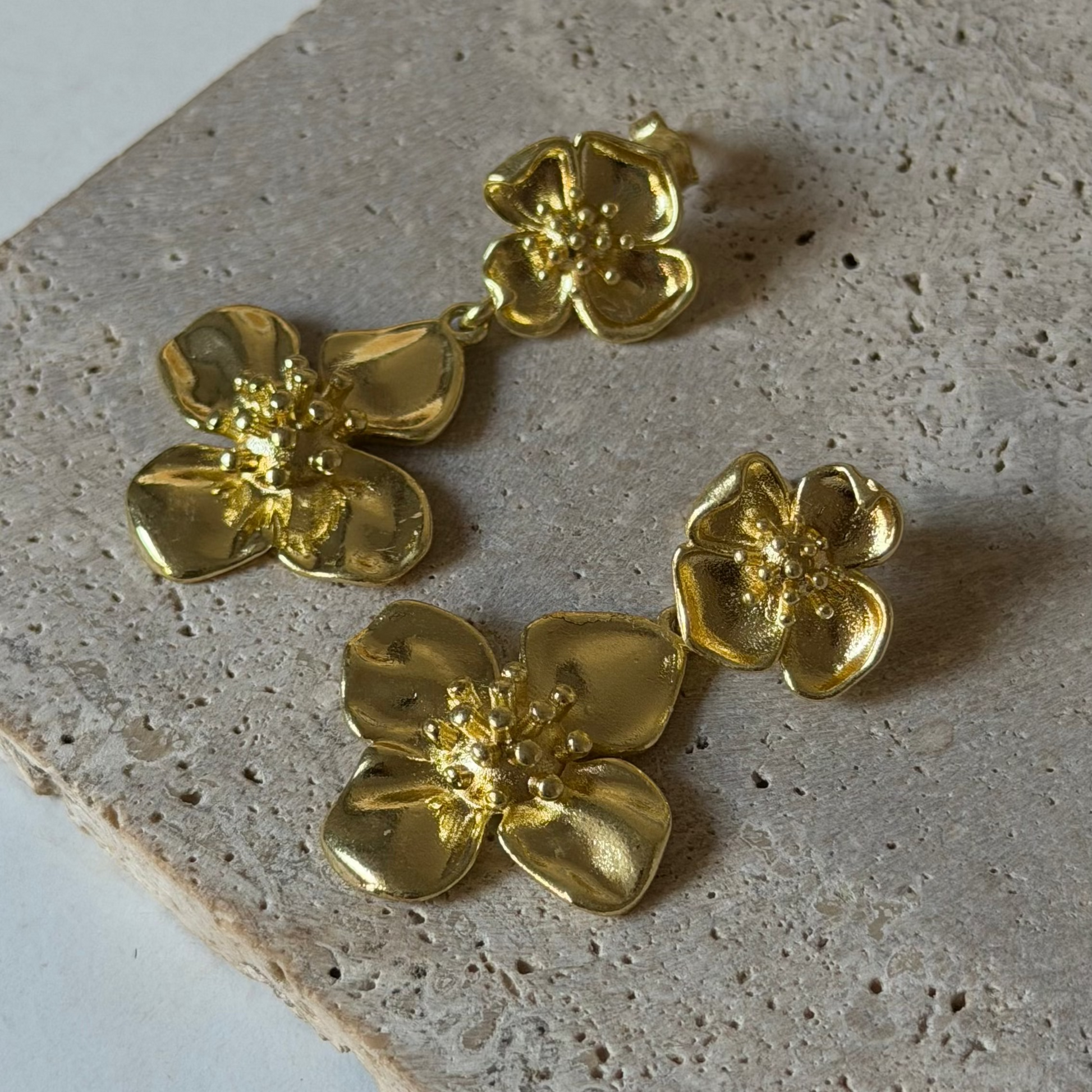 Aros colgantes de flores enchapados en oro, con un diseño delicado y femenino inspirado en la naturaleza. Ideales para complementar looks diarios o especiales, aportan brillo, elegancia y un estilo atemporal. Una joya versátil pensada para realzar tu esencia con un toque romántico.