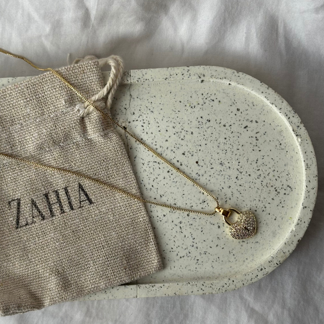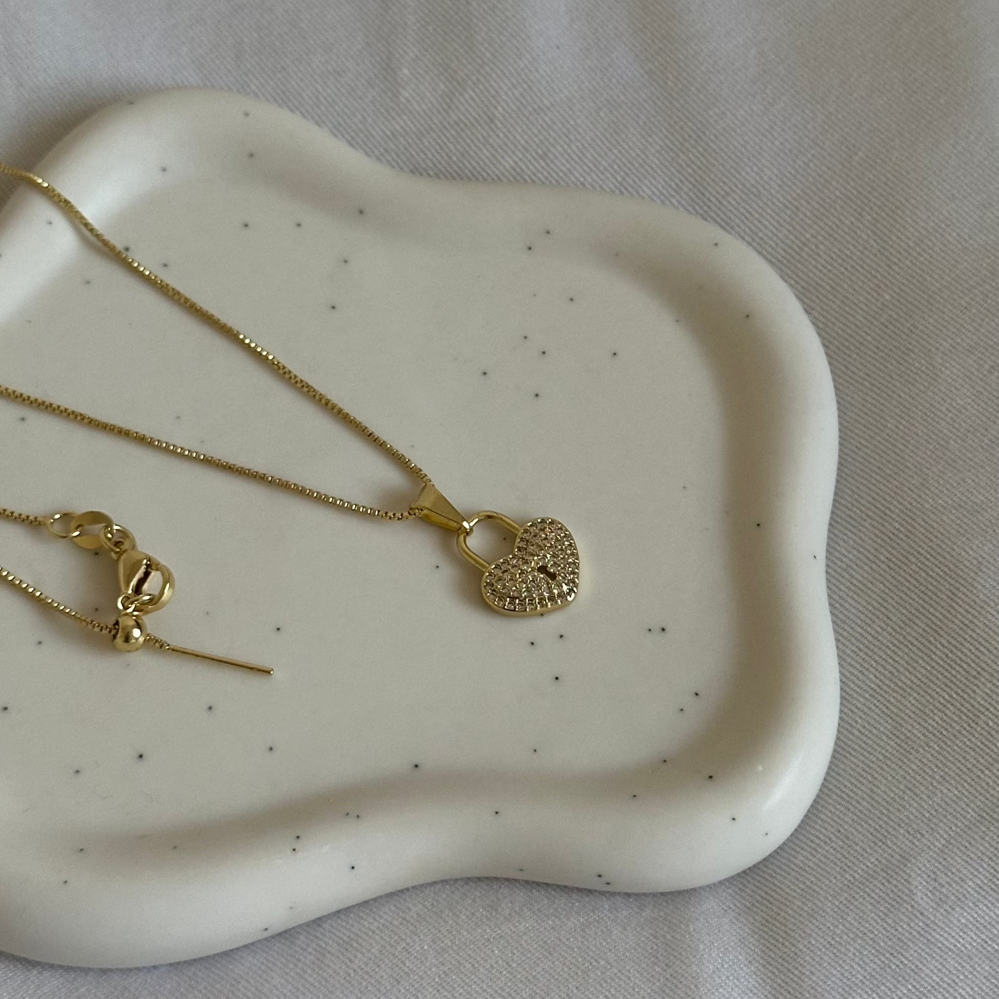 Este elegante collar de 45 cm, ajustable y Bañado en oro, presenta un encantador dije en forma de candado y corazón, adornado con circones brillantes. Ideal para regalar a esa persona especial, combina sofisticación y un toque personal que captura el amor y la exclusividad en cada detalle.