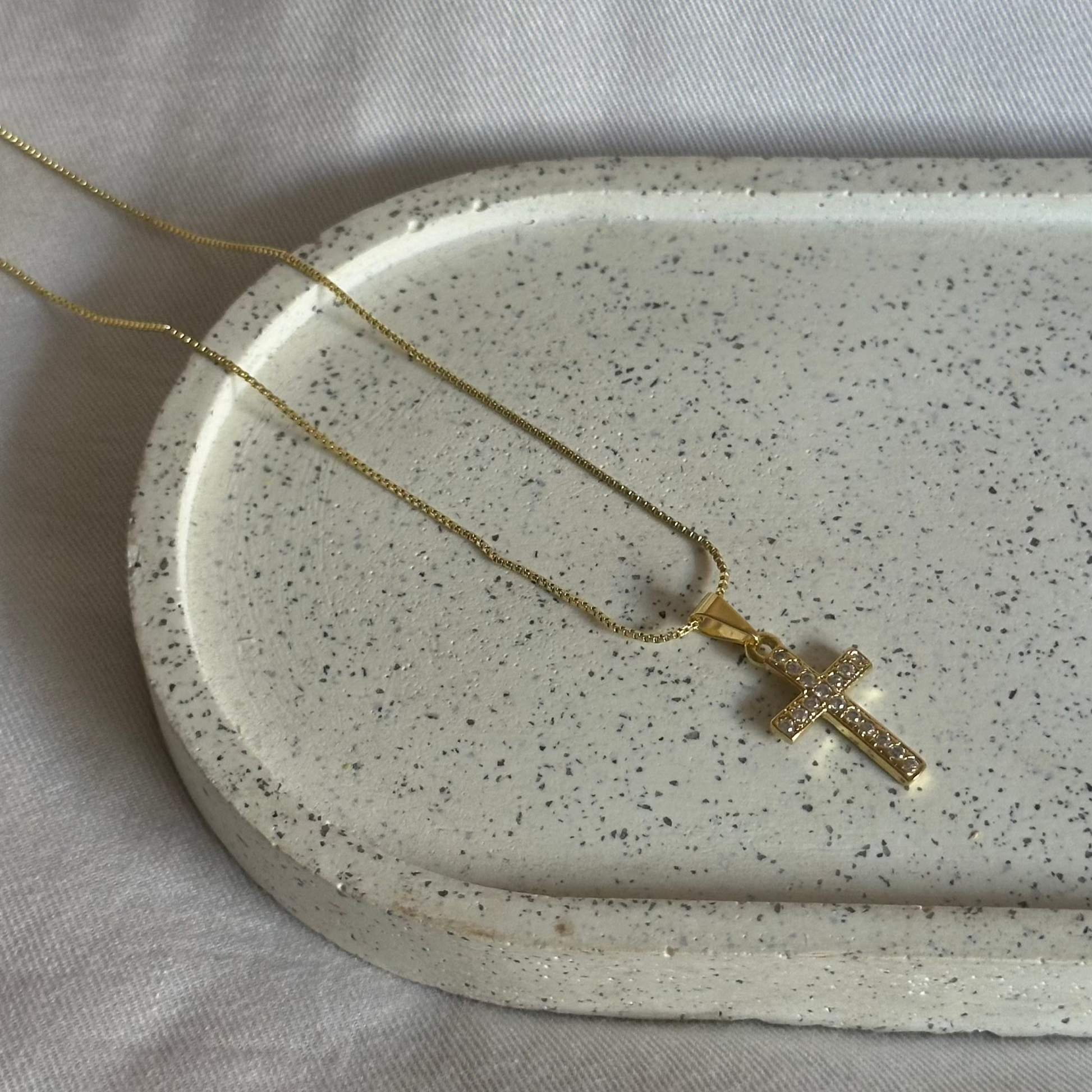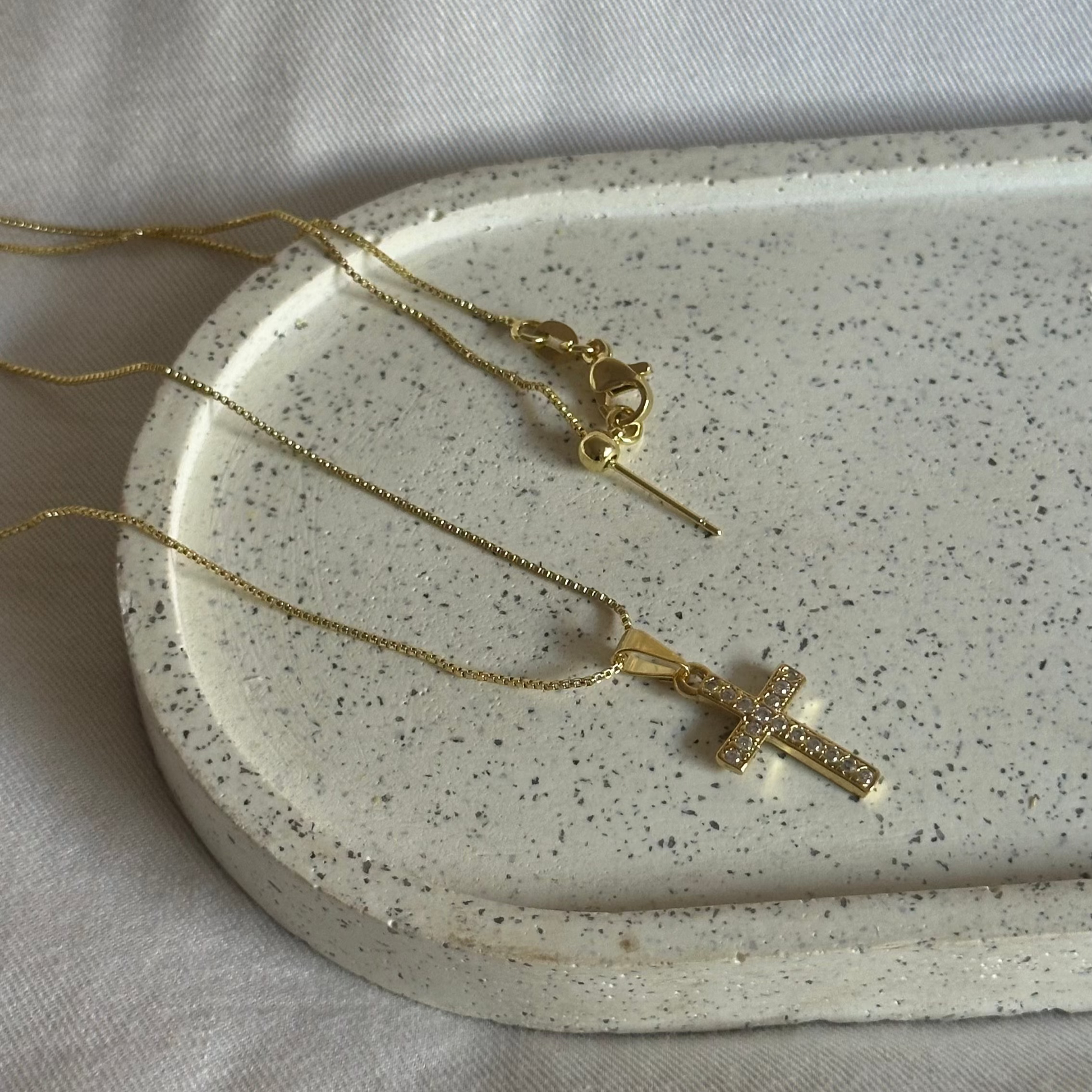 Un diseño lleno de significado y sofisticación. Este elegante collar de cruz, Bañado en oro y decorado con circones brillantes, es el complemento perfecto para realzar tu estilo con un toque de luz y elegancia. ✨