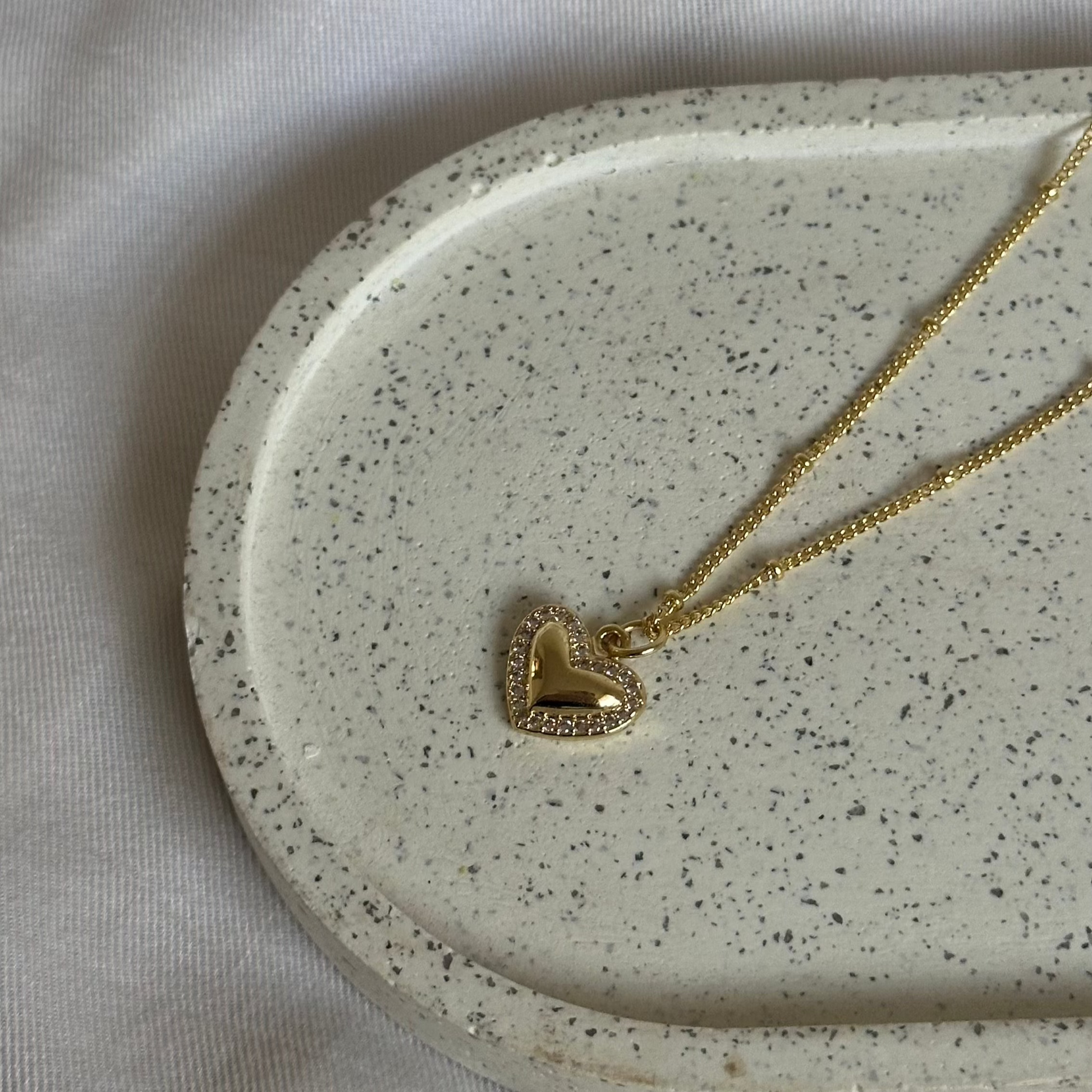 Un elegante collar de 40 cm con un delicado dije de corazón enchapado en oro 18k, adornado con circones que brillan con cada movimiento. Un toque romántico y sofisticado para cualquier ocasión