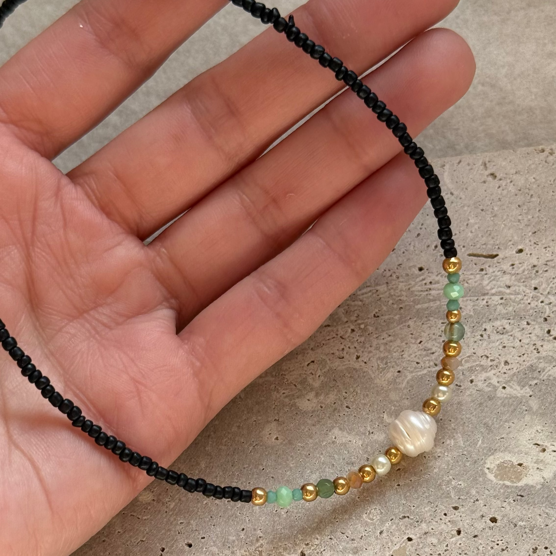 Una joya delicada y llena de armonía. Este collar hecho a mano de 40 cm + 5 cm de extensión combina piedras Miyuki, cristales, una piedra ágata facetada y una hermosa perla de río en el centro. Los balines y detalles bañados en oro 18K le aportan un toque de luz y sofisticación.