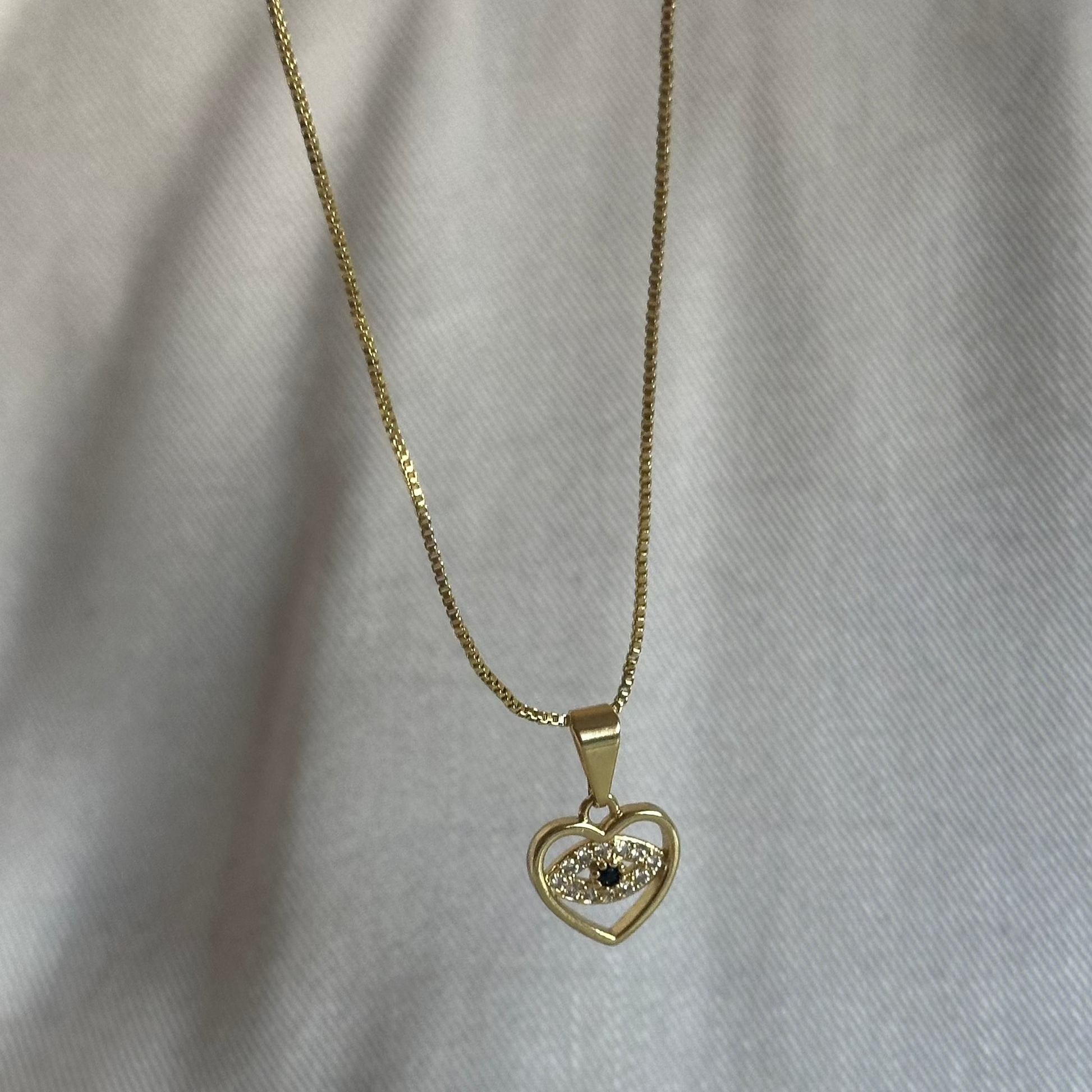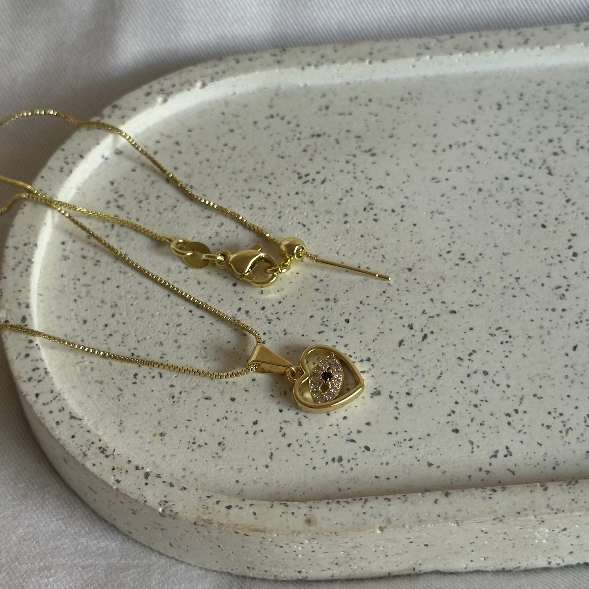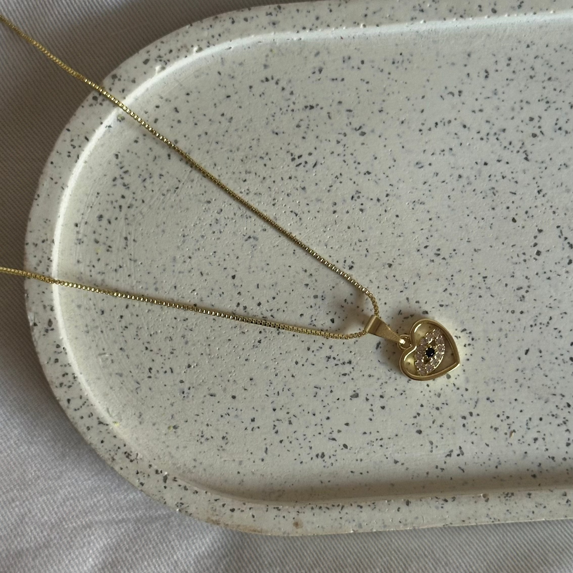 💎 Materiales: Dije de corazón con ojo turco, circones brillantes y circón negro central, bañado en oro 18K