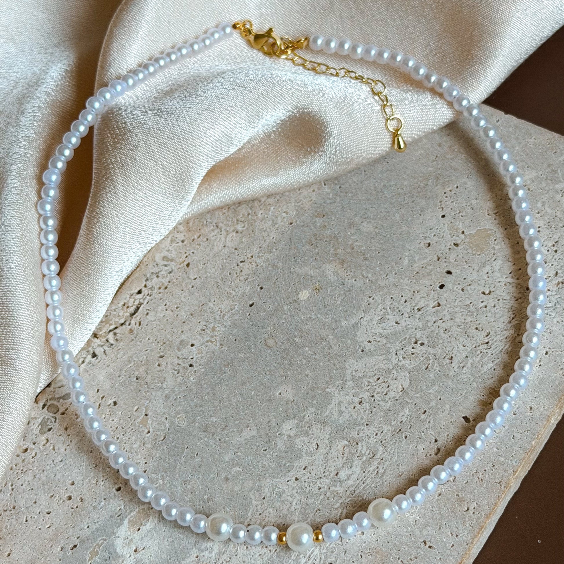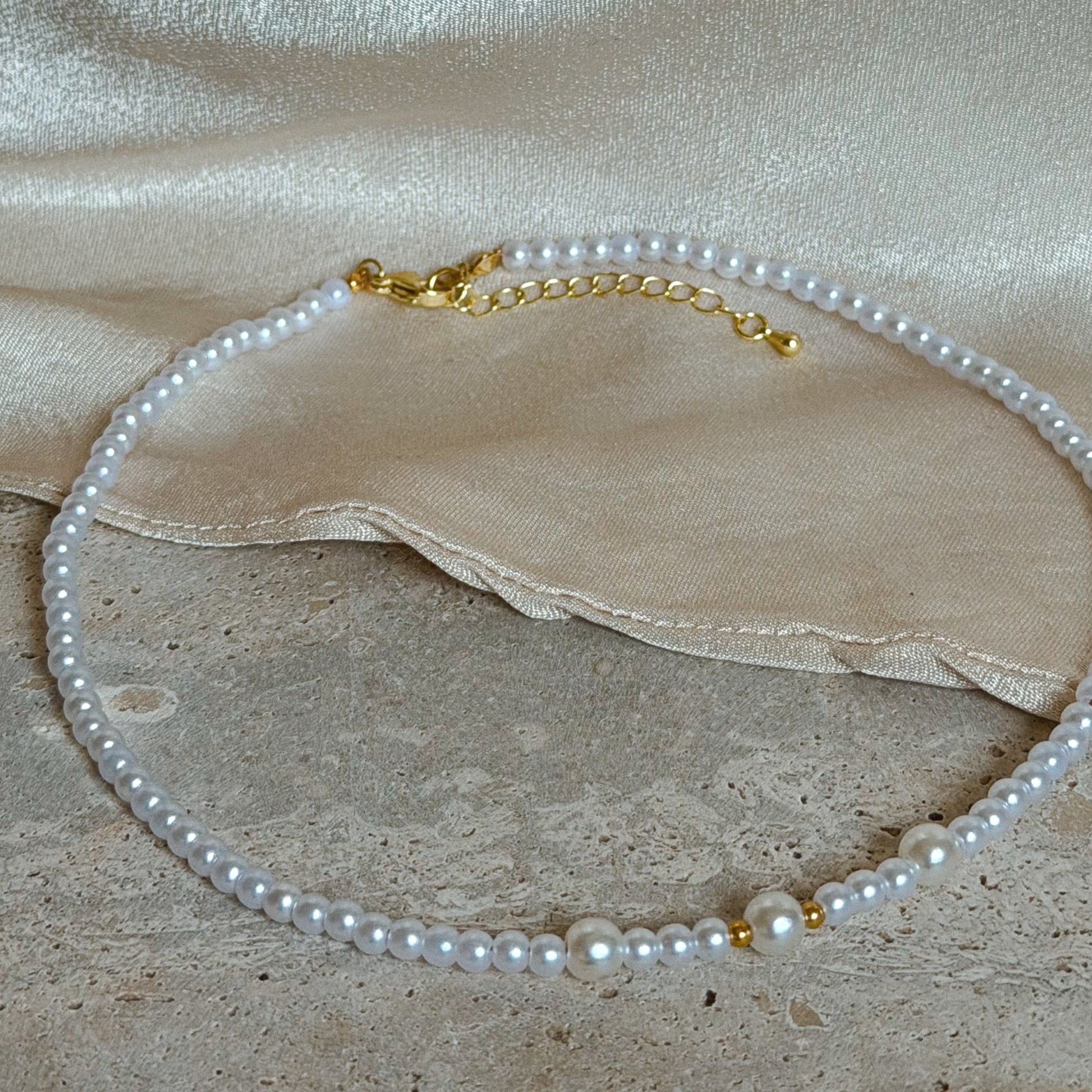 La elegancia está en los detalles. Nuestro Collar Perla Simple con Balines combina la delicadeza de la perla con sutiles balines y detalles bañados en oro 18K, creando una joya atemporal, versátil y llena de sofisticación.