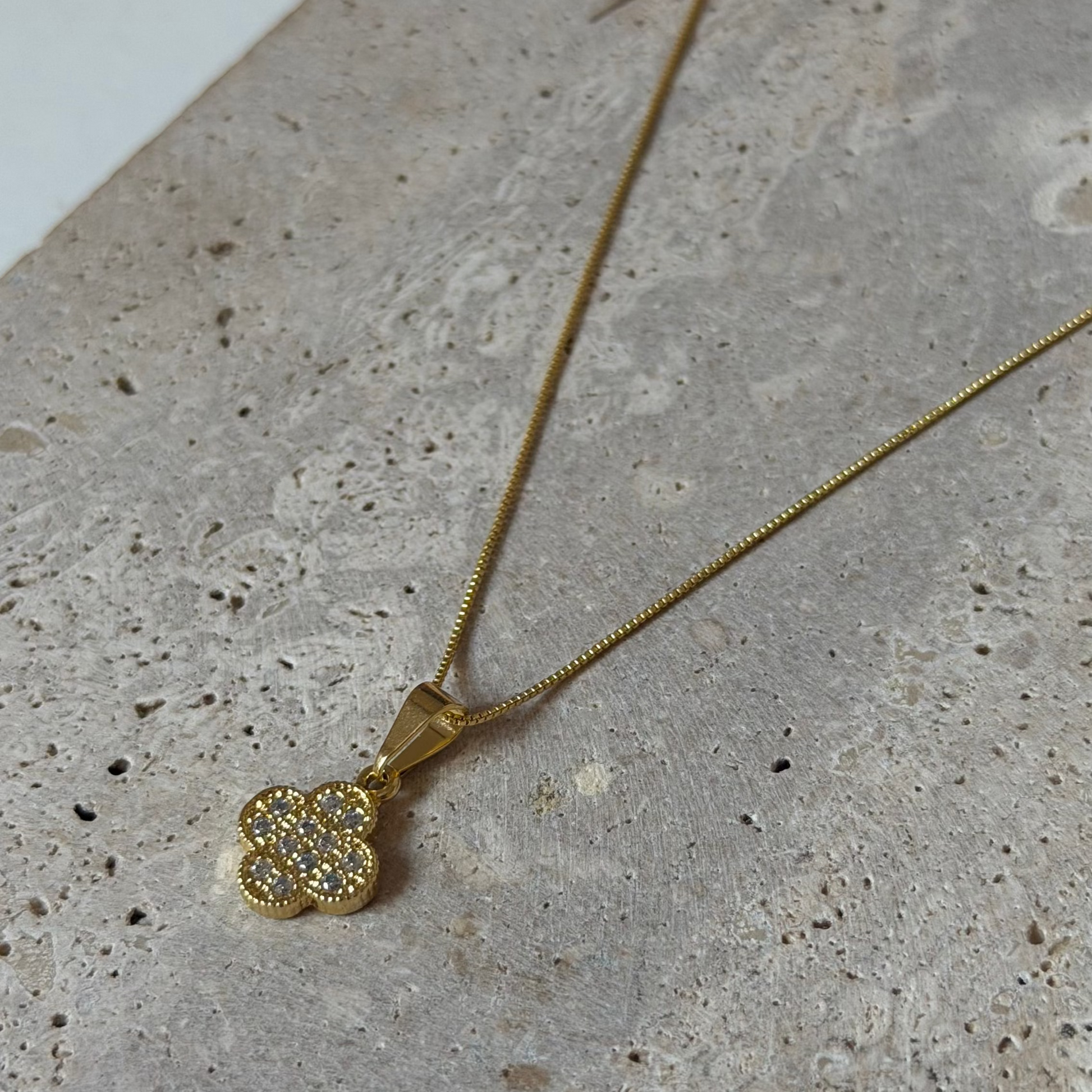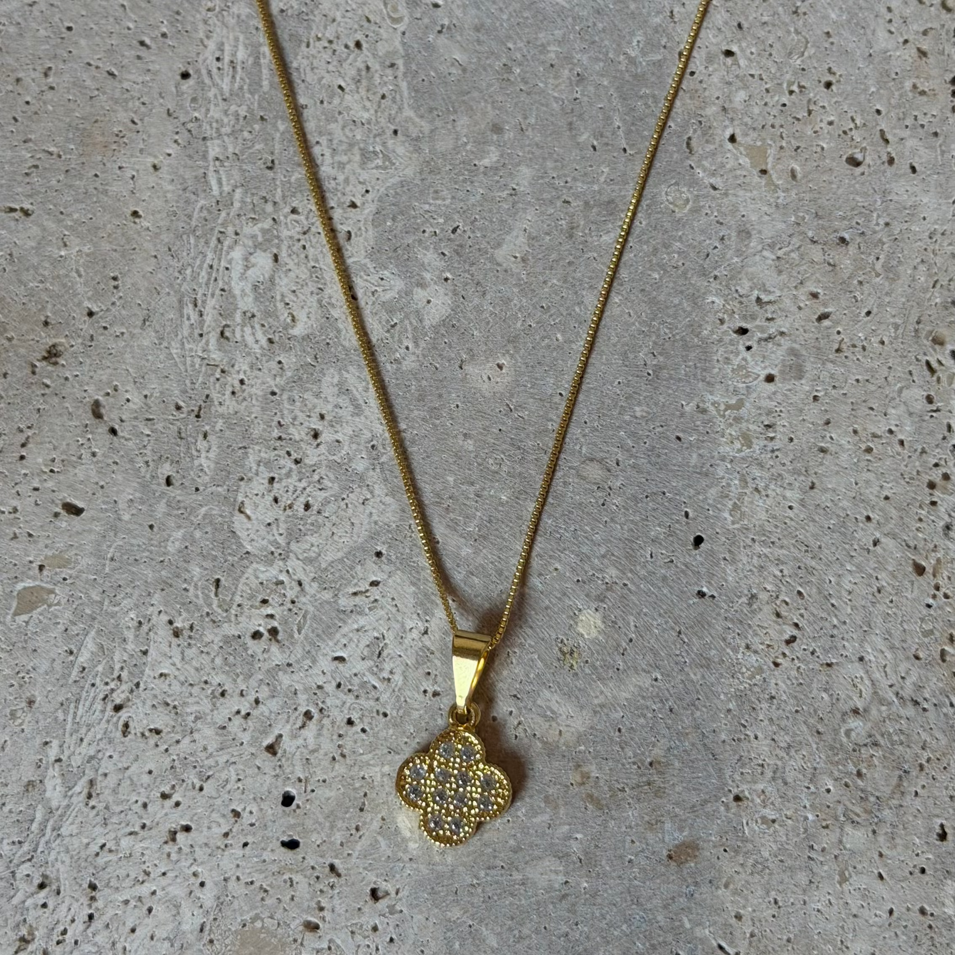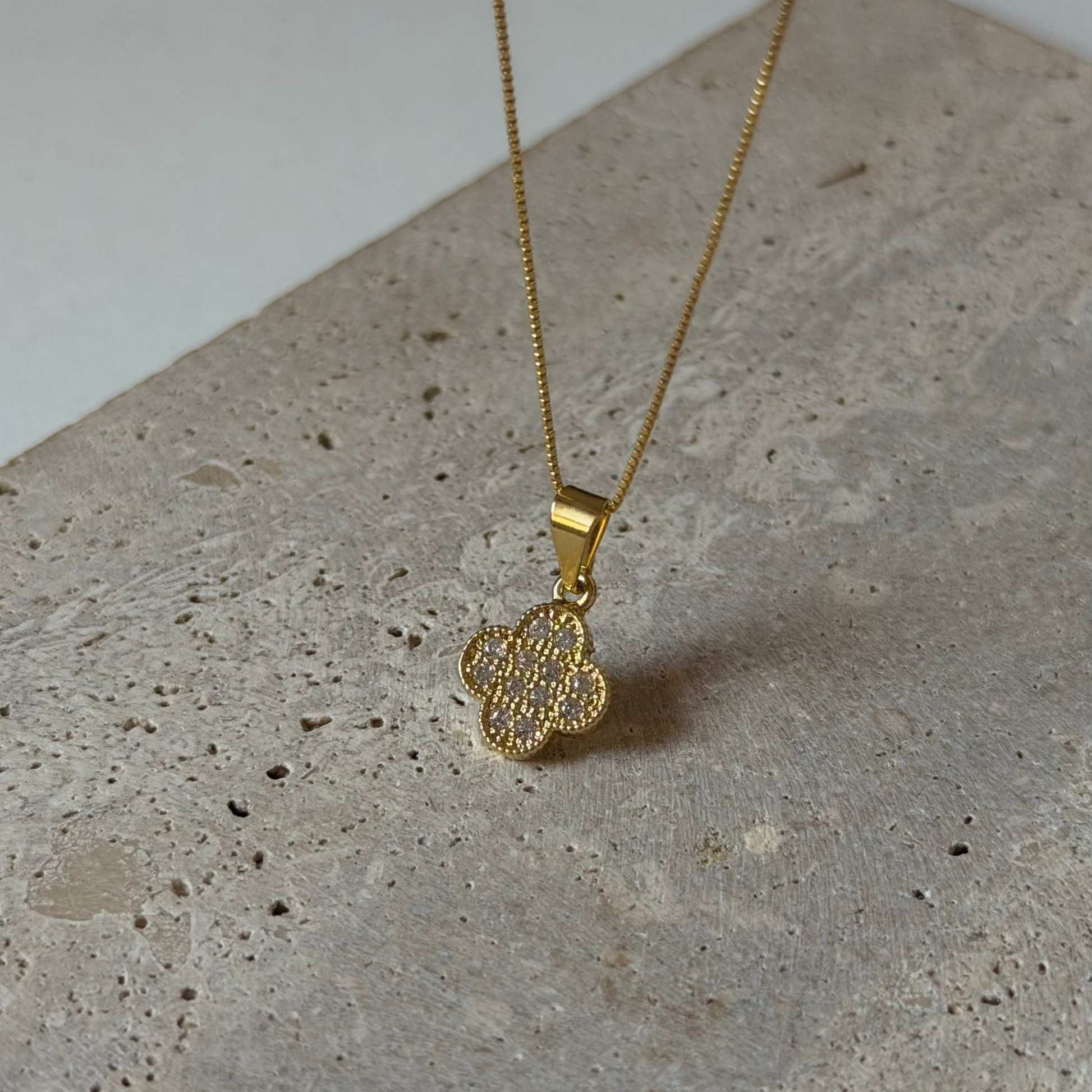 Collar Trébol con circones enchapado en oro, con delicada cadena veneciana de 40 cm. Símbolo de buena suerte, abundancia, protección y equilibrio, una joya luminosa y elegante que realza cualquier look y atrae energías positivas.